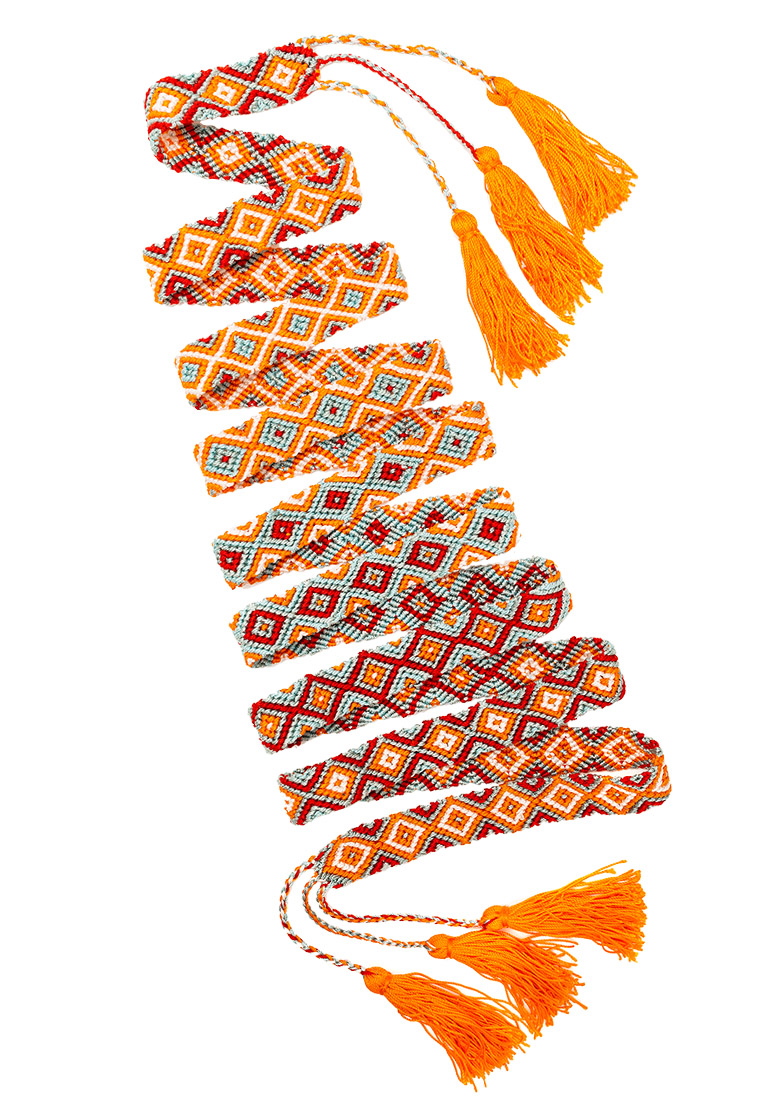 Die geknoteten Gürtel kommen aus Peru und werden in der traditionellen Knotentechnik von Hand produziert. Einzelne Farbfäden, bis zu 12 m lang, werden akribisch zu wunderschönen geometrischen Mustern geknotet. Wir arbeiten mit Frauengruppen aus den indigenen Völkern in den Anden zusammen, die einen verlässlichen und fairen Lohn erhalten, mit dem sie einen Beitrag zum Familienunterhalt leisten können.