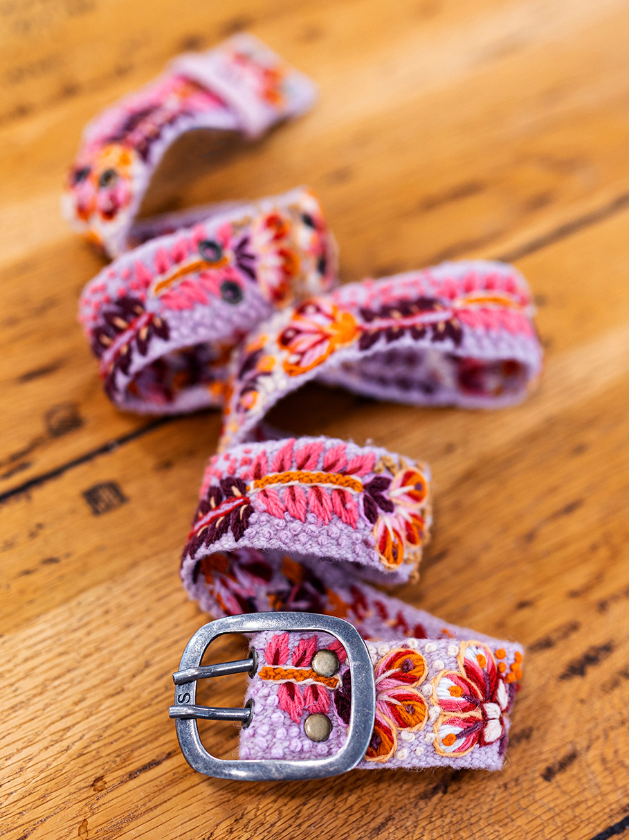Eine von Hand gestickte wunderschöne Blätter-Blütenranke in Apricot-Lachs-Rost-Braun-Tönen machen diesen Gürtel zu einem ganz besonderen Accessoire, das bewundernde Blicke auf sich zieht.
