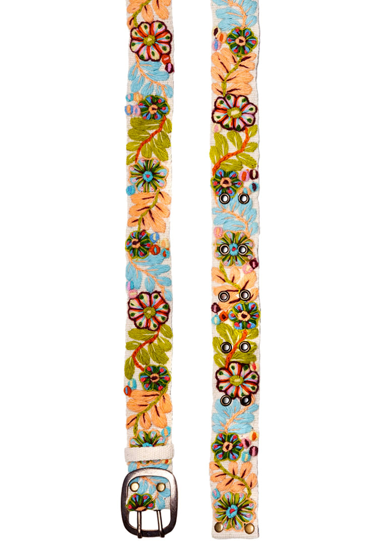 Zarte Pastellfarben und ein wunderschönes Blüten-Blättermuster, das schon fast plastisch wirkt, zieren den von Hand bestickten Gürtel aus Peru. Ein vielseitig kombinierbares Accessoire.