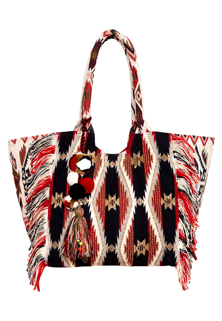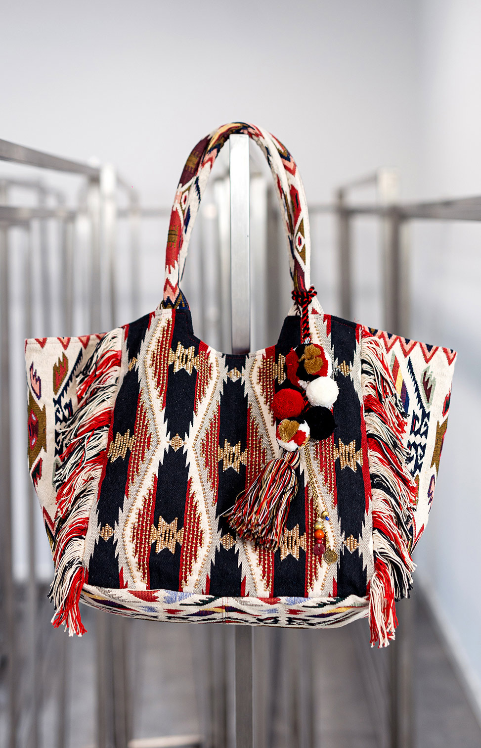 Ein wunderschönes aztekisches Muster, das noch zusätzlich mit feinen goldenen Perlen bestickt ist und der Ethno-Tasche einen edlen Schimmer verleihen, machen diese Tasche zu einer ganz besonderen Begleiterin. Praktisch fürs Büro, für den Einkauf oder den Strand.