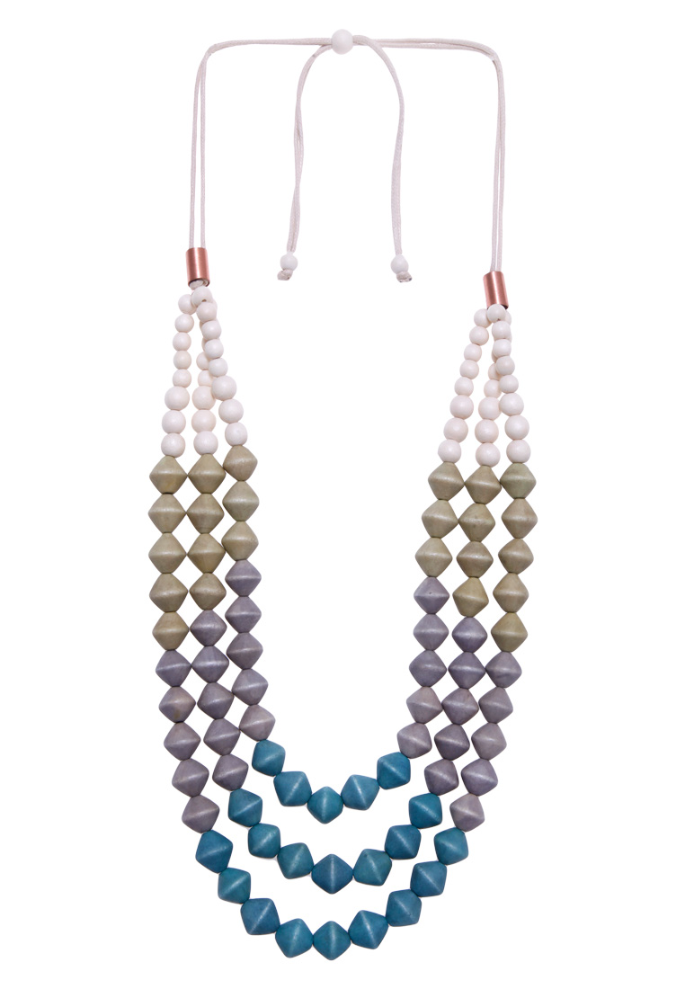 Die Halsketten sind aus Holz gefertigt. Das Holz ist ein Material, das aus Cebu, in den Philippinen einheimisch ist. Dieses Holz lässt sich besonders gut einfärben. Die Handwerkergruppe Fame Foundation verwendet ein Holz, das ständig nachgepflanzt wird. Sie arbeiten eng mit dem Ministerium für Umwelt und natürliche Rohstoffe vor Ort zusammen, um diese Holzart im öffentlichen Waldland zu kultivieren und zu pflanzen, die den Bauerngemeinschaften den Lebensunterhalt sichert. Die Gruppe braucht aber für ihren Schmuck nur sehr kleine Mengen und ernten das Holz wenn es “reif” ist. Der Zyklus des Wiederanbaus dieser Bäume wird fortgesetzt, der die Nachhaltigkeit des Materials gewährleistet. Das Holz wird dann mit einfachen Fräsmaschinen verarbeitet, um verschiedene Perlen zu produzieren, die zu Modeschmuck werden. Die Gruppe beschäftigt Hausfrauen, die wegen ihrer Hausarbeit keinen Vollzeitjob nachgehen können, aber so zusätzliches Familieneinkommen verdienen, wenn sie zu Hause die Ketten und anderem Schmuck produzieren.