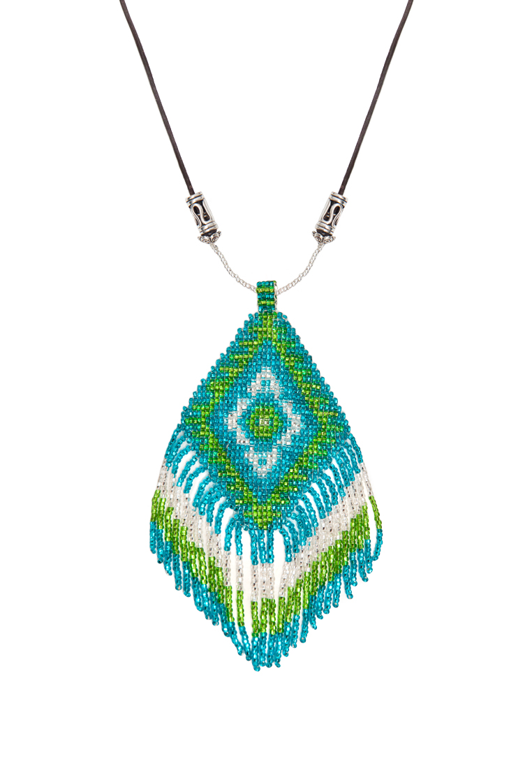 Der ausdruckstarke Anhänger macht die Kette zu einem Hingucker mit Hippie-Touch. Die Perlen werden in Handarbeit gewebt. Mit weiteren Schmuckelementen und einem Lederband.