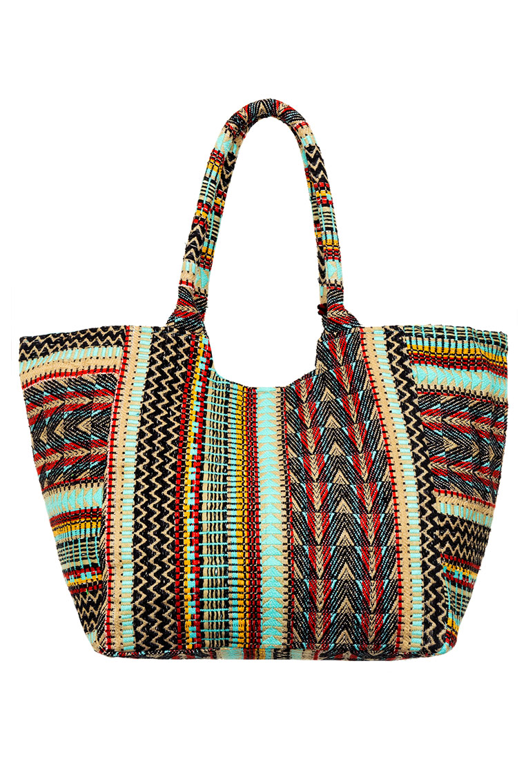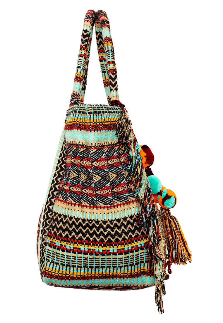 Eine besonders schöne Farbkombination in Türkis-, Orange- und Lilatönen gemischt mit einem coolen Muster, das mit Pailetten und Perlen bestickt ist, machen diese Tasche zu einer besonderen Begleiterin.