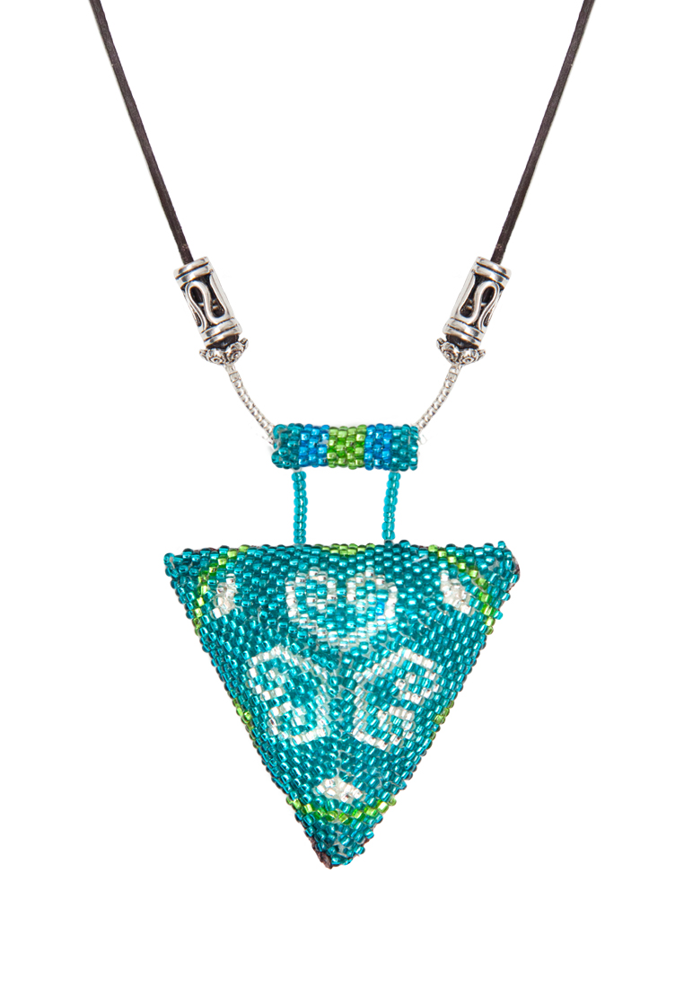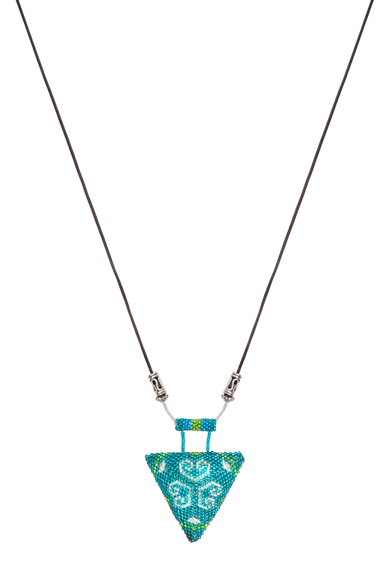 Die Kette Triangle ist ein eher zartes Accessoire, mit dem du dennoch für einen echten Hingucker sorgst. Hier wurden feinste Glas-Perlen zu einem traditionellen Muster Südamerikas verwoben. Der Anhänger in Dreiecksform ist auf haltbares Leder-Material genäht und leicht wattiert, so dass ein wunderbar plastischer Eindruck entsteht. Mit der Kette Triangle kannst du jeden noch so schlichten Pulli, ein einfaches Shirt oder einfarbiges Kleid effektvoll aufwerten.
