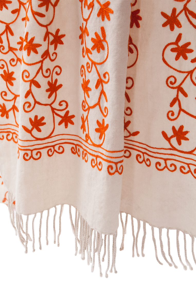 Farben machen fröhlich! Das gilt umso mehr, wenn die Farben sich in schönen Ranken auf einem liebevoll bearbeiteten Schal aus 100% reiner, weicher Wolle zeigen. Dieser größere Schal aus Indien ist vollflächig mit einem Blumenranken-Muster bestickt.Wie auch immer Sie dieses besondere Accessoire tragen möchten – ob vorne geknotet oder lose umgehängt – die ausdrucksstarke Stickerei ist immer sichtbar.  Die Wolle hat eine mittlere Stärke und macht den Schal zu einem idealen Begleiter in allen Jahreszeiten.